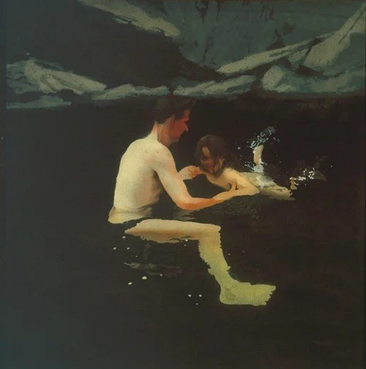 I doubt Michael Andrews intended it but this painting is almost an inverse of the image we’re so used to in religious paintings of Mary and the Christ Child. But it is a monumental rite of passage. Do you remember the moment you learned to swim or perhaps your child doing the same? The father here, the artist himself, is about to let go and we can sense his concern just as we glimpse his daughter Melanie’s excitement. For learning to swim is to learn to be independent, to be free. Such moments are also fraught. The black water looks cold and threatening. The way Andrews has painted the figures, the enlarged foot, his sun-reddened neck and forearms all emphasise the frailty of flesh.